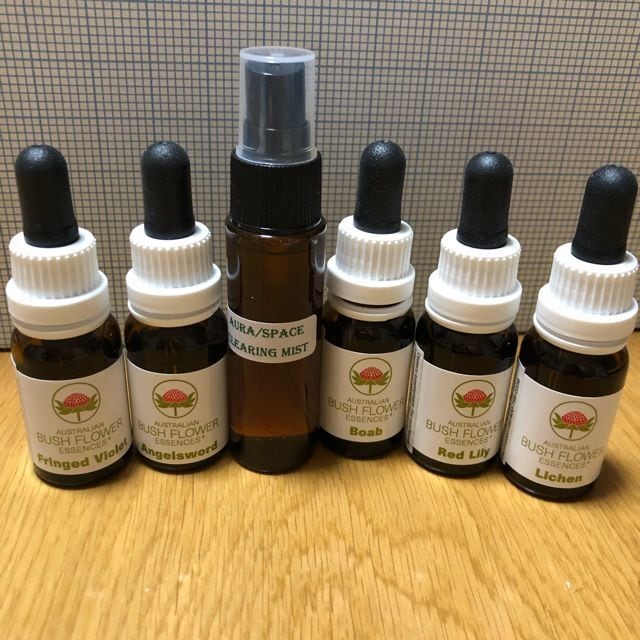 オーラ・スペースクリアリングミストにはネガティブなエネルギーを開放するボアブ、オーラ全体に働きかけ、オーラプロテクションするエンジェルソード、傷ついたオーラの修復をするフリンジドヴァイオレット、ダークなエネルギーを取り去り、未浄化霊を光の世界に導くライケン、散漫になっている気のグラウンディング・センタリングを助け、場のエネルギーを高めるレッドリリーのエッセンスが入っています。保存用に少量のブランデーと食用の植物性グリセリンが入っているので、肌にスプレーすると肌ストレスを和らげ、しっとりとうるわせます。また、心地よい香りづけのための食用のミントオイルが入っているので、空間にスプレーしたり、口にスプレーするとさわやかな風味を感じていただけます。オーストラリアブッシュのスペースクリアリングミストは50mlで4000円位しますので、内容がほぼ一緒のこちらはとてもお得です(こちらは内服もできますし、肌にも良いのでさらにおすすめです)